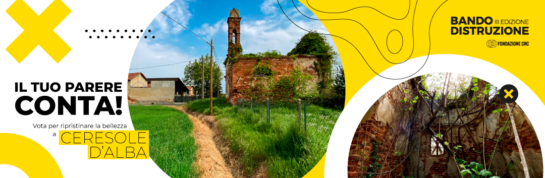 Il Comune di Ceresole d'Alba in collaborazione con la Parrocchia di Cappelli di Ceresole d'Alba sta partecipando al Bando Distruzione della Fondazione CRC. Il bando prevede di individuare opere fatiscenti o in stato di degrado per riqualificarle se possibile o demolirle. Nel nostro caso abbiamo superato la prima fase con il progetto di recupero della cappella dei Madonna della neve in località Cabasse.