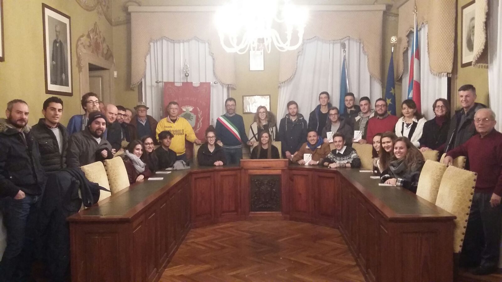 Nella foto: il gruppo dei diciottenni nella sala del Consiglio Comunale con amministratori e associazioni.