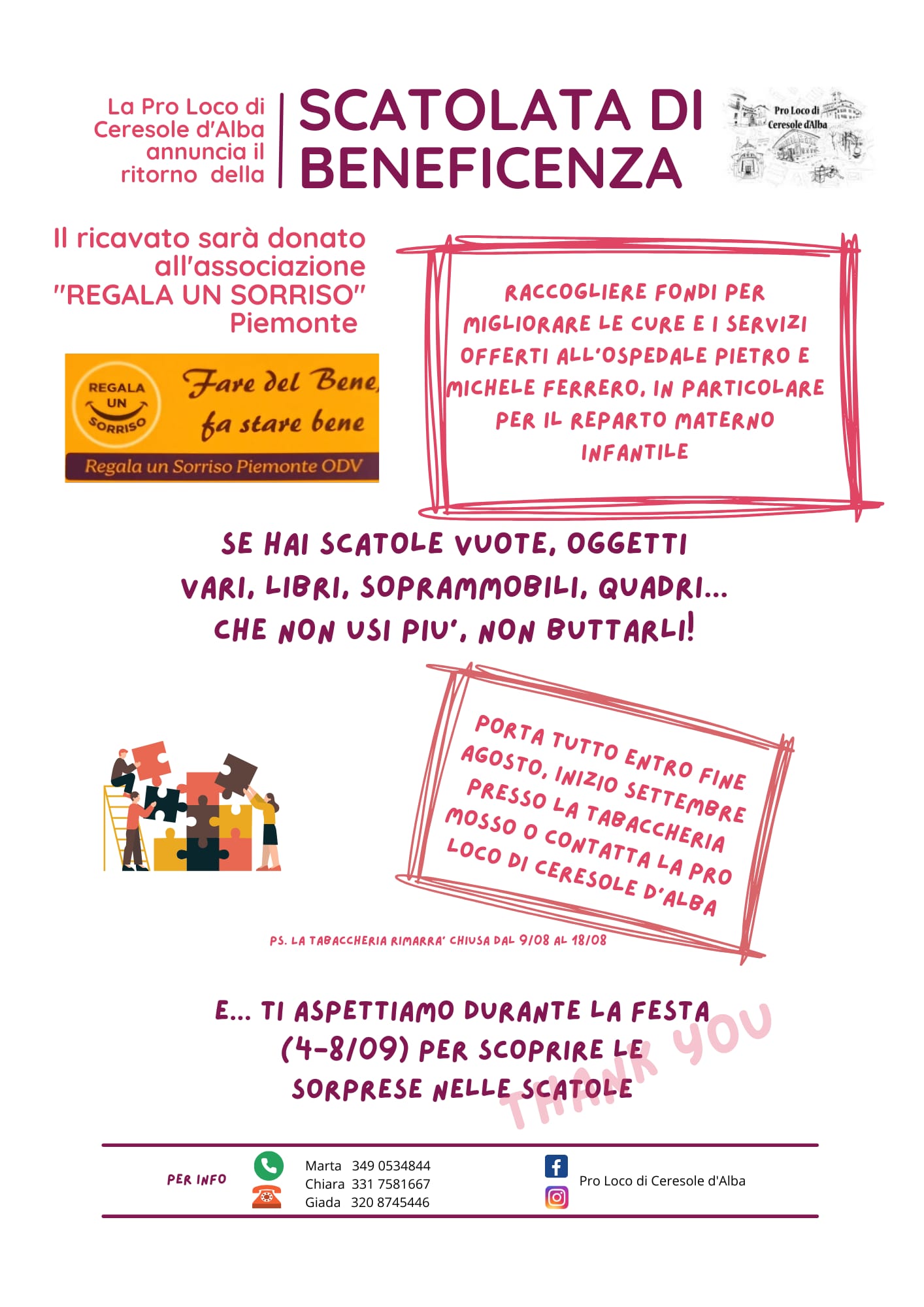 Durante tutta la Festa sarà possibile partecipare alla scatolata di beneficenza, il cui ricavato sarà donato all'associazione "REGALA UN SORRISO" Piemonte, che si occupa di raccogliere fondi per migliorare le cure e i servizi del reparto materno infantile dell'Ospedale Michele e Pietro Ferrero a Verduno.