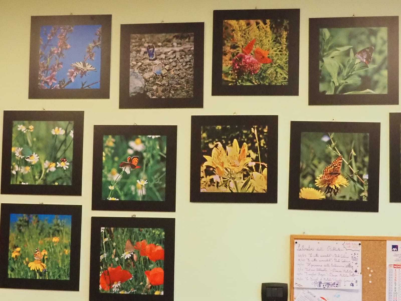 Diciassette scatti, diciannove farfalle ed una coccinella, sfocata, quasi invisibile in mezzo a tanto colore e leggerezza, riempiono una parete della Biblioteca, quasi a suggerire un caso di omografia: le farfalle sono leggére ed abbelliscono, ora, un luogo deputato al léggere.
