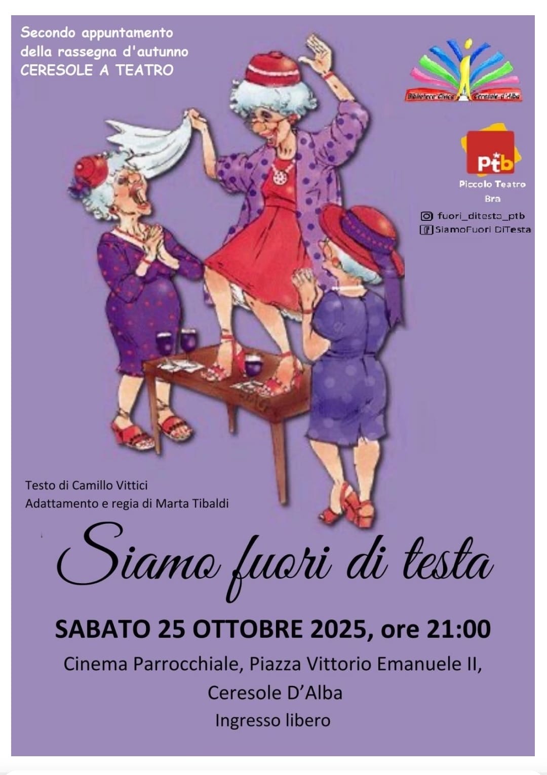 Sabato 25 ottobre secondo appuntamento della rassegna teatrale d’autunno dal titolo “Siamo fuori di testa”, alle ore 21:00 presso il cinema parrocchiale in Piazza Vittorio Emanuele II, ingresso libero.