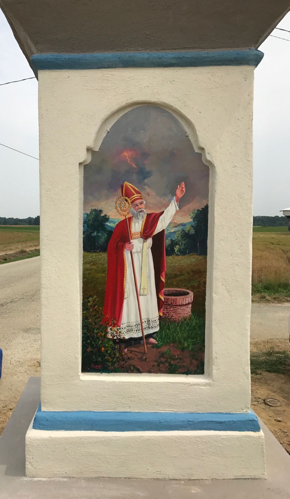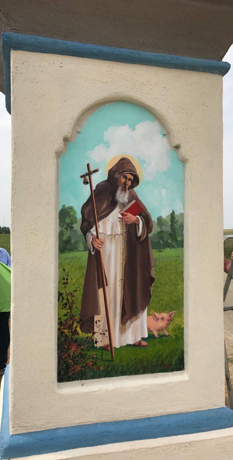 4) Questa è la facciata più danneggiata. Per ricostruirla ho dovuto sentire gli anziani. I quali mi hanno dato questa interpretazione. I campi e gli animali erano protetti da primi due Santi, Le donne e i bambini erano protetti dalla Madonna, ma bisogna proteggere anche i capofamiglia che in quel momento di calamità, erano diventati i cacciatori. Difendevano le cascine dagli animali selvatici che arrivavano dai boschi delle vicine località del Caratto e di Ternavasso e la caccia era anche diventata una risorsa per il sostentamento della famiglia.