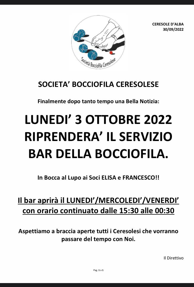 La Società Bocciofila ceresolese comunica che da lunedi 3 ottobre riprenderà il servizio bar presso la struttura. In allegato i dettagli.