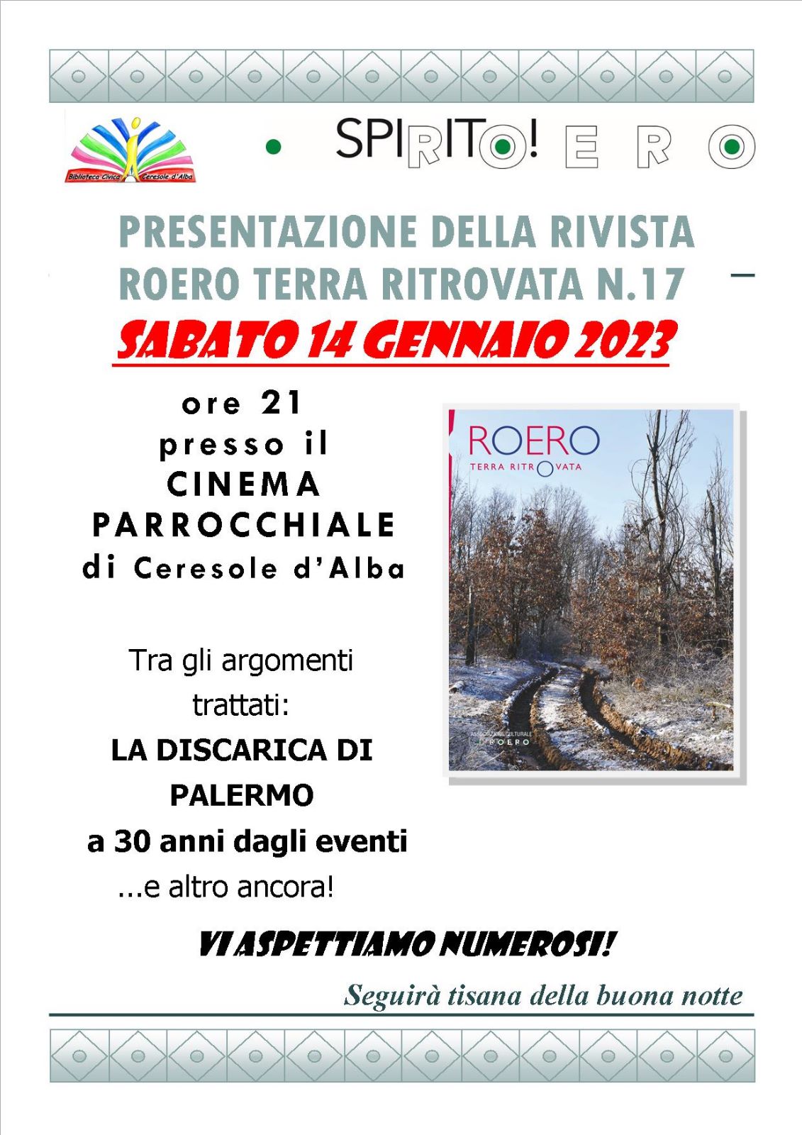 SABATO 14 GENNAIO 2023 ore 21 presso il cinema parrocchiale di Ceresole d'Alba verrà presentato il nuovo numero di "Roero terra ritrovata", rivista storica del Roero.