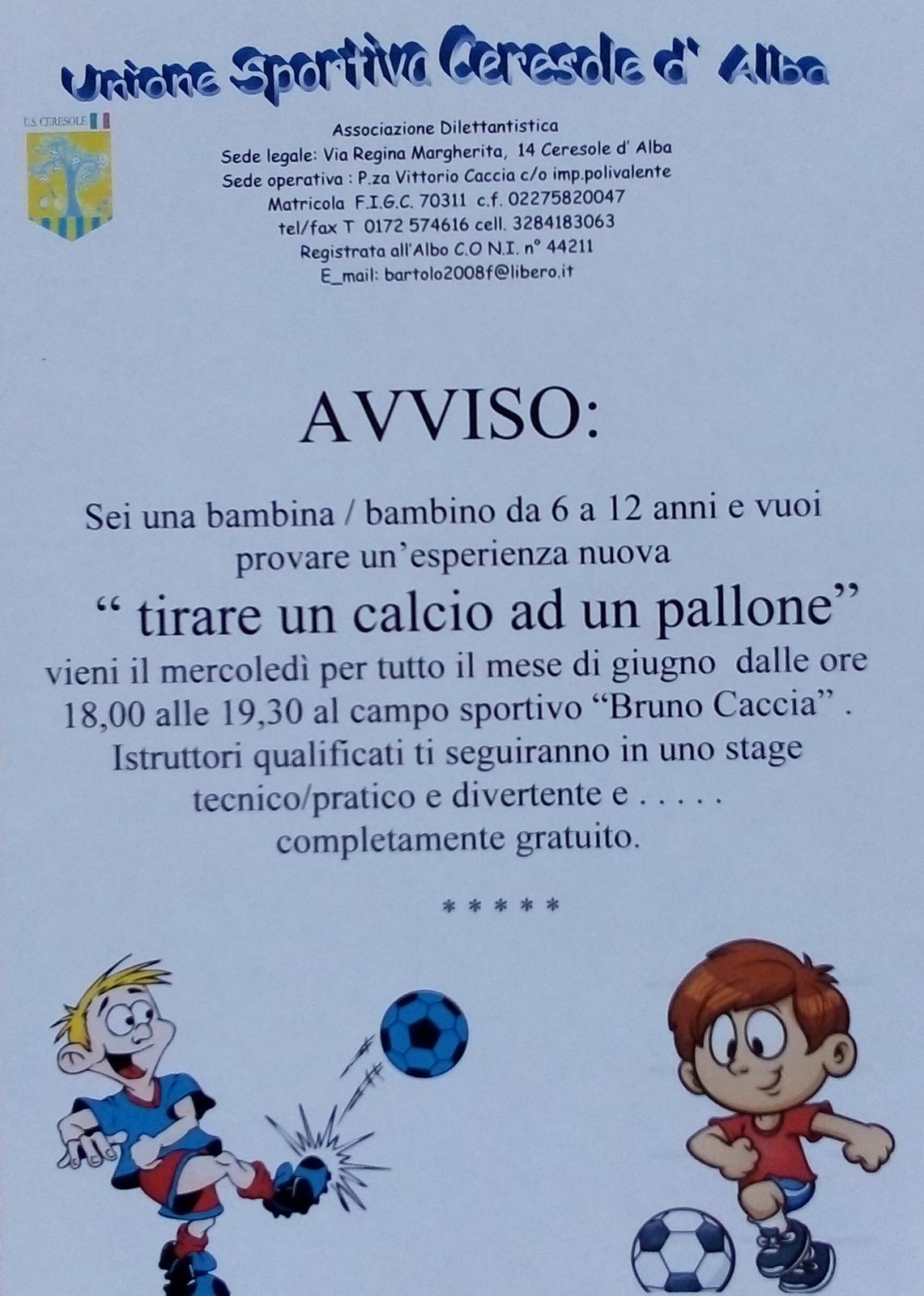 L'Associazione sportiva di Ceresole invita tutti i ragazzi/e dai 6 ai 12 anni a provare l'esperienza di "Tirare un calcio ad un pallone".