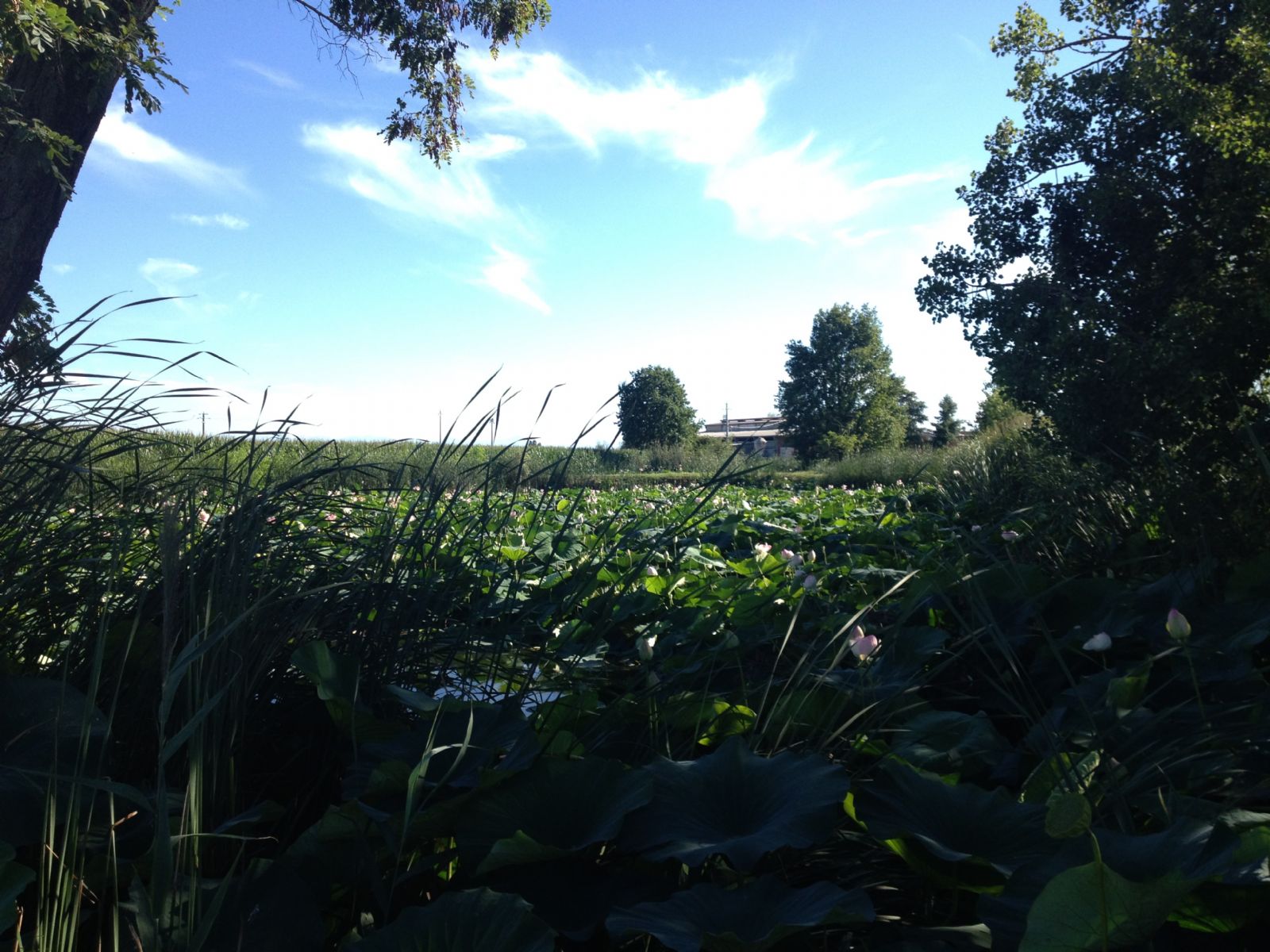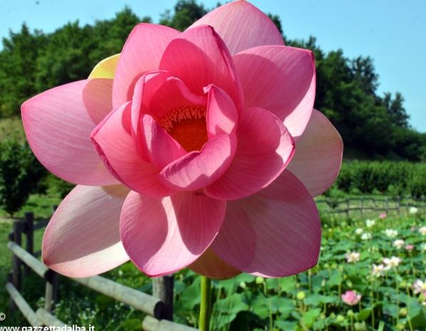 La Nelumbo Nucifera, questo il nome scientifico del fior di loto, ricopre per intero tre grossi invasi lunghi ciascuno un centinaio di metri e larghi altrettanto presso la cascina Gallina, in frazione Cabasse. È un fiore possente, dallo stelo robusto, alto quasi due metri, con petali rosati e foglie di un verde brillante, anch’esse pendenti da altissimi steli e larghe fino a 80 centimetri. L’altezza dello stelo permette al loto di gettare le radici sul fondo dei fiumi e sbucare oltre la superficie dell’acqua come una ninfea. Nelle peschiere della cascina Gallina, però, l’acqua è sensibilmente più bassa. E allora il fiore prorompe in tutta la sua altezza, facendo esplodere i suoi grossi boccioli non sul pelo dell’acqua, ma al di sopra di una foresta composta dalle sue stesse, enormi foglie: “La cosa singolare è che il fiore resiste alle gelate invernali, al freddo, alla neve”, racconta Edoardo Pellissero, la cui famiglia negli anni Ottanta ha acquistato la cascina Gallina e accoglie di tanto in tanto gli sporadici turisti. “Io non devo fare nulla: d’inverno il loto scompare, riposa sotto la superficie dell’acqua. Ma in primavera rinasce all’improvviso e durante il periodo della fioritura, luglio e agosto, getta i suoi fiori verso il cielo, come fosse qui da sempre”.La bellezza del loto è anche un mistero “tecnologico”. Il cosiddetto effetto loto è la capacità di questo fiore di restare pulito grazie a microscopici cristalli di cera che rivestono la sua superficie esterna, creando un mantello idrorepellente. Sulle foglie di loto l’acqua scivola via portando con sé sporcizia e insetti indesiderati, una caratteristica oggi studiata avidamente dalle aziende tessili, ma considerata simbolo di purezza in Oriente, tanto che l’induismo e il buddismo lo reputano un fiore sacro. Un'altra peschiera di loto. Una sacralità che, attraversato le peschiere di Ceresole, è in qualche modo migrata al culto della Vergine. Gli studi di Alberto Lusso, storico del Roero, hanno messo in luce come a partire dagli anni Trenta del Novecento la comunità religiosa di Ceresole abbia adottato gli splendidi petali di loto per abbellire le funzioni dell’Assunta. Per celebrare la Madonna dalla Cascina Gallina ne venivano portati grandi mazzi: “Li raccoglievamo chiusi e aprivamo le foglie ad una ad una nell’acqua o con le dita bagnate”, racconta Domenica Caratto, classe 1933. “Non c’era festa dell’Assunta senza fiori di loto. La chiesa era tutta ornata con questi bellissimi fiori”.