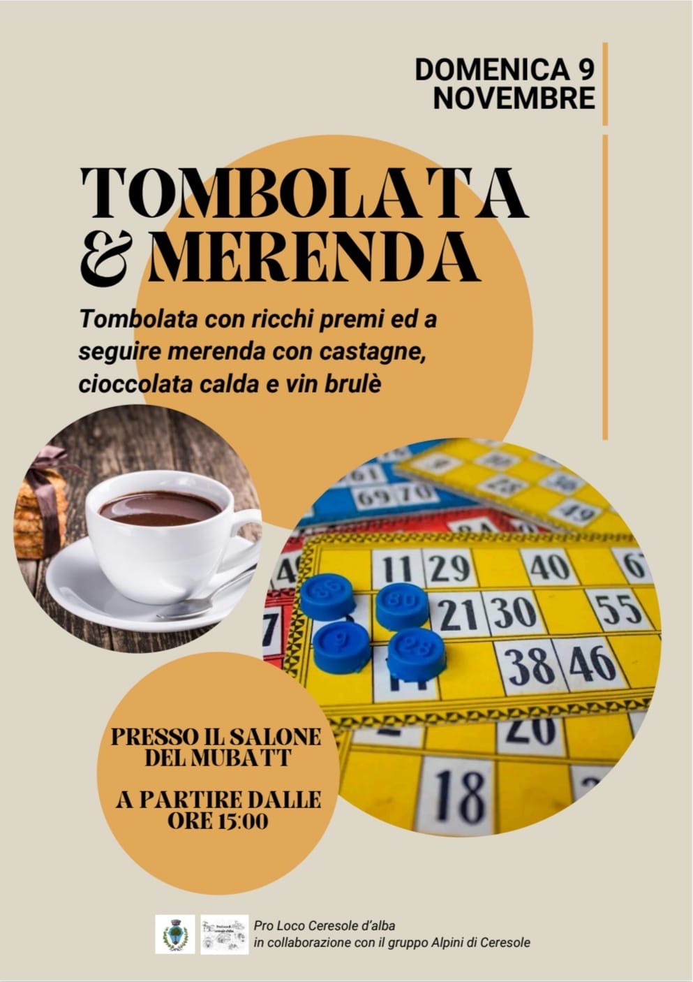 Domenica 9 novembre a partire dalle ore 15:00 la Pro Loco di Ceresole d'Alba in collaborazione con il gruppo Alpini organizza la tombolata con ricchi premi presso il salone del Mubatt; a seguire merenda con castagne, cioccolata calda e vin brûlé.