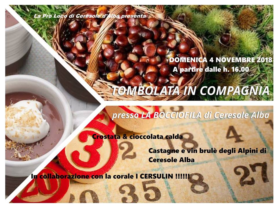 Domenica 4 Novembre a partire dalle ore 16.00 presso la Bocciofila di Ceresole d'Alba, grande tombolata con ricchi premi. A seguire crostata e cioccolata calda della Pro Loco, castagne e vin brulè degli Alpini di Ceresole d'Alba. Con la partecipazione della nostra corale i "CERSULIN".