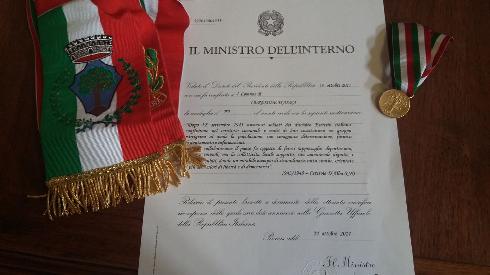 Riportiamo la motivazione del riconoscimento: "Dopo l’8 settembre 1943 numerosi soldati del disciolto Esercito italiano confluirono nel territorio comunale e molti di loro costituirono un gruppo partigiano al quale la popolazione, con coraggiosa determinazione, forniva sostentamento e informazioni.Per tale collaborazione il paese fu oggetto di feroci rappresaglie, deportazioni, razzie e incendi, ma la collettività locale sopportò, con ammirevole dignità, i patimenti subiti, dando un mirabile esempio di straordinarie virtù civiche, orientate ai più alti valori di libertà e di democrazia.1943/1945 – Ceresole D’Alba"