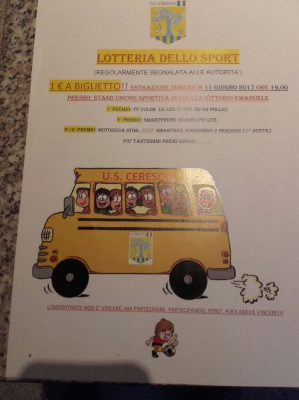 Sono ancora in vendita in queste settimane i biglietti della “Lotteria dello sport” per finanziare l’acquisto di un mezzo a 9 posti per l’Associazione sportiva. Il mezzo ha già ricevuto un finanziamento da parte della Fondazione CRC e del Comune di Ceresole d’Alba. L’estrazione dei ricchi premi (vedi allegato) avverrà l’11 giugno durante la Fiera delle Terre Rosse.