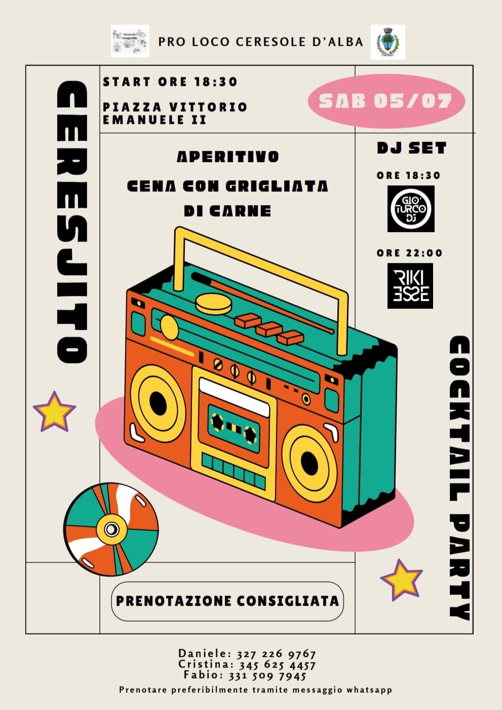 Sabato 5 luglio la Pro Loco di Ceresole d’Alba propone il Ceresjito e cocktail party, una serata con aperitivo cena e dj set in Piazza Vittorio Emanuele II a partire dalle ore 18:30.