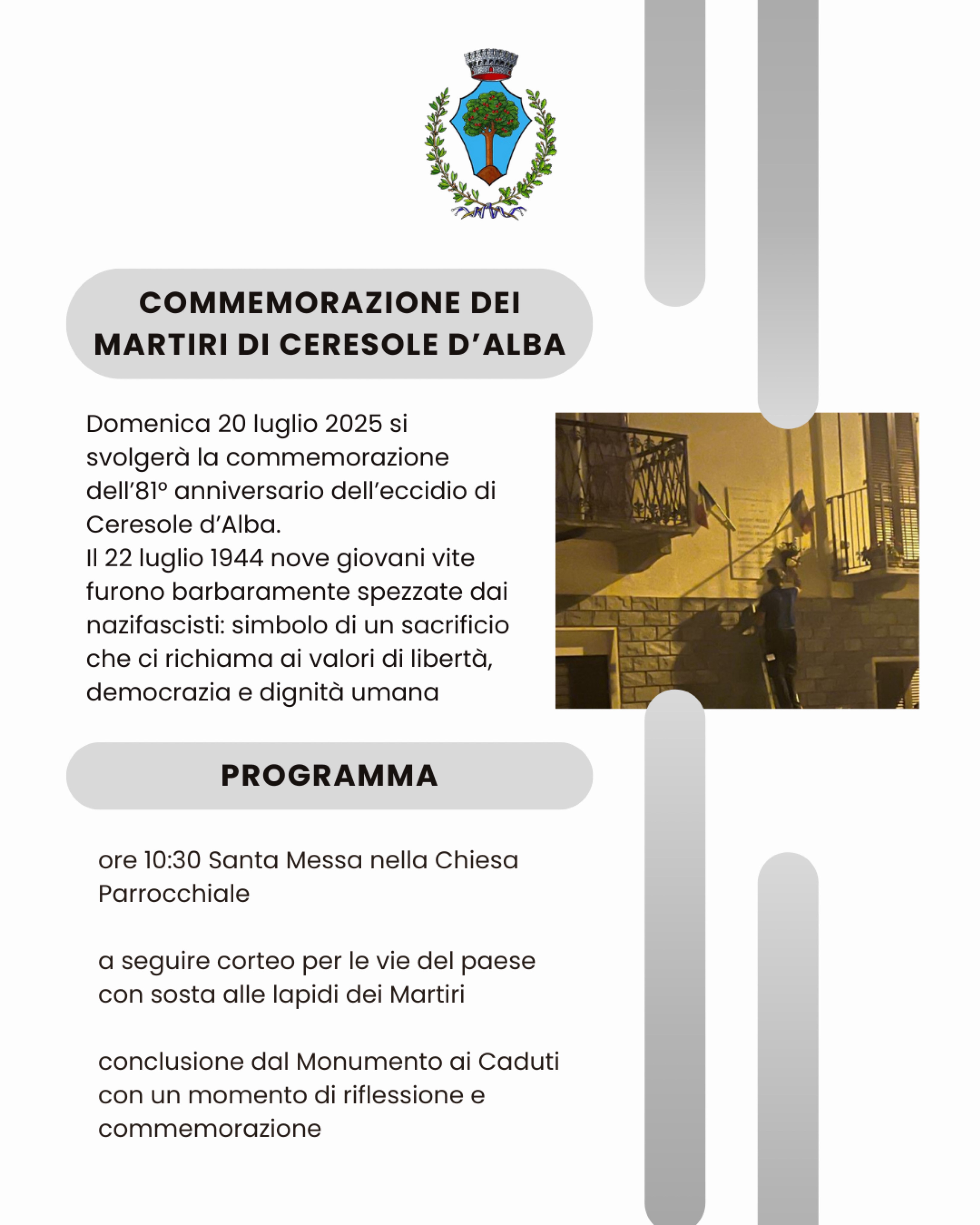 Il programma prevede la Santa Messa alle ore 10:30 nella parrocchia di San Giovanni Battista, a seguire ci sarà la processione in Via Martiri di Ceresole d'Alba con deposizione di fiori dalle lapidi, che si concluderà dal Monumento ai Caduti con un momento di riflessione.