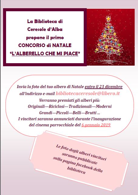 La Biblioteca Civica di Ceresole d'Alba propone il concorso di Natale "L'Alberello che mi piace". Si possono inviare le foto del proprio albero di Natale entro il 23 dicembre all'indirizzo della Biblioteca: bibliotecaceresole@libero.it
