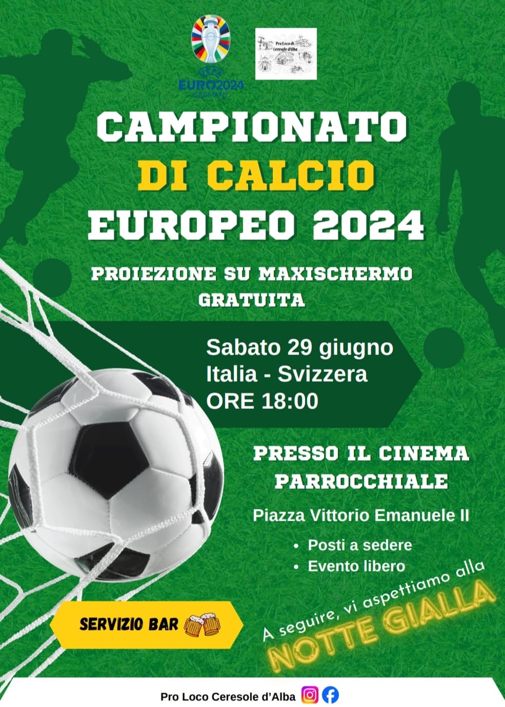Rimane confermata la proiezione del campionato di calcio Europeo 2024 Italia-Svizzera ore 18:00 presso il cinema parrocchiale.