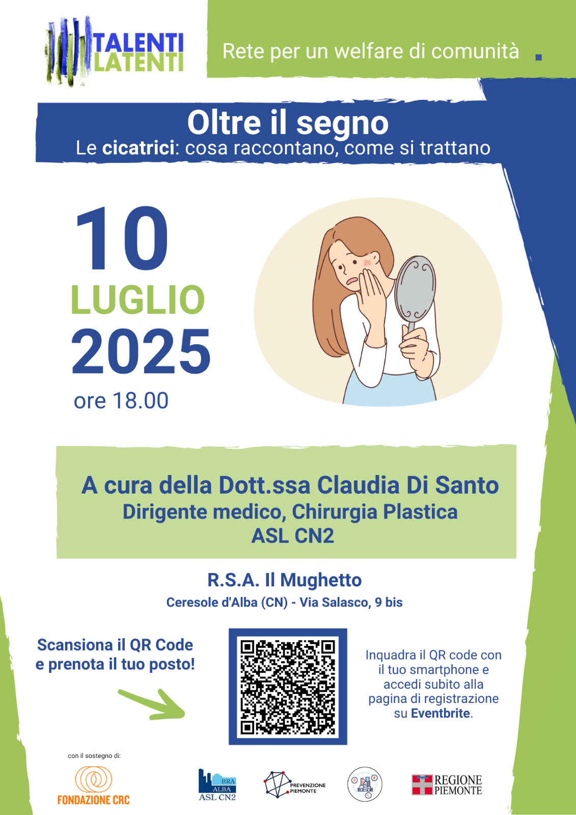 Giovedì 10 luglio alle ore 18:00 presso la R.S.A. Il Mughetto di Ceresole si svolgerà il quarto appuntamento del ciclo “Giovedì di Talenti 2025”, dal titolo “Oltre il segno”, dedicato al tema delle cicatrici: cosa raccontano e come si possono trattare.