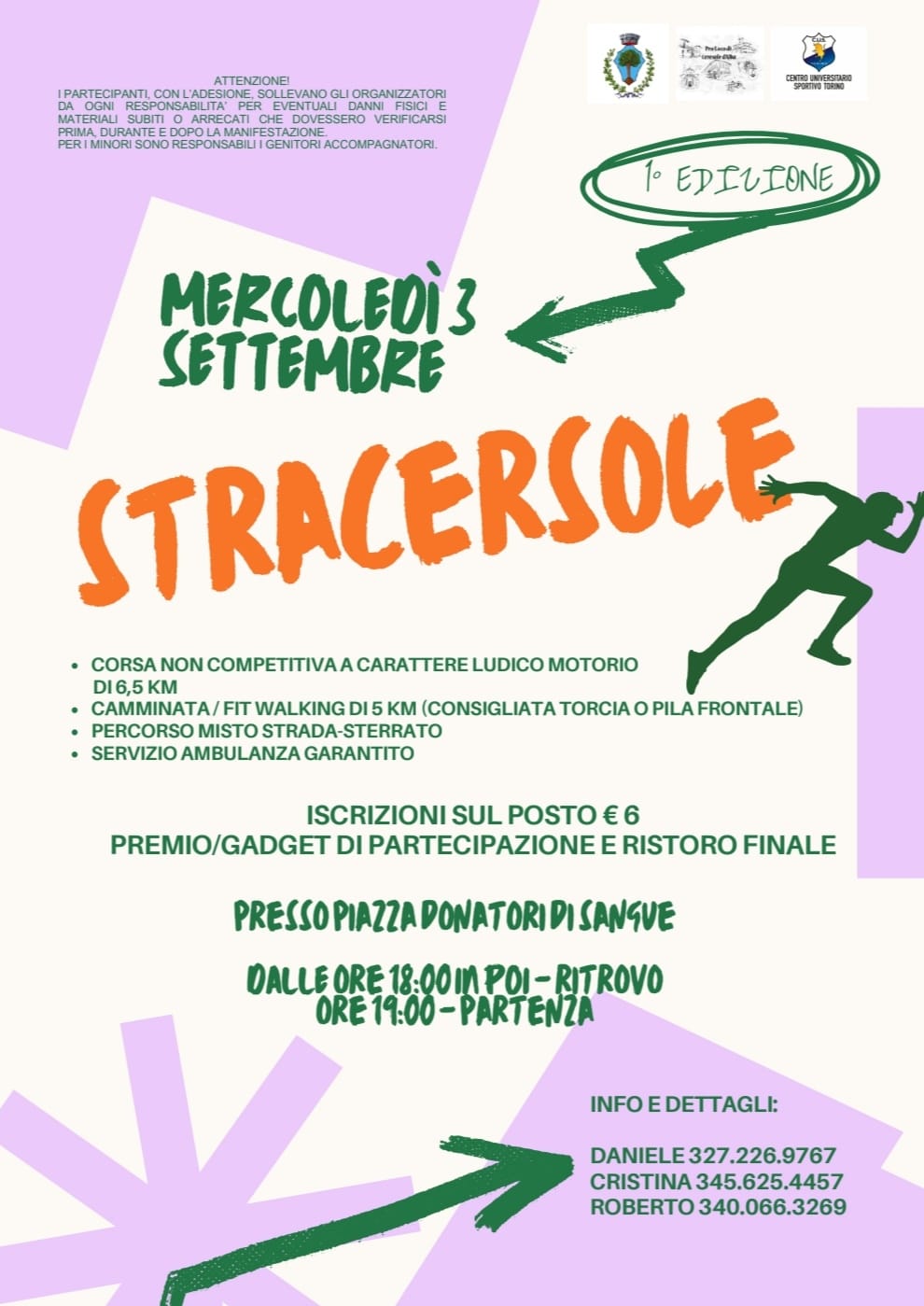 Mercoledì 3 settembre si svolgerà la prima edizione della "STRACERSOLE", una corsa non competitiva a carattere ludico motorio di 6,5 km sul territorio comunale di Ceresole d'Alba; in alternativa sarà possibile optare per una camminata di 5 km.