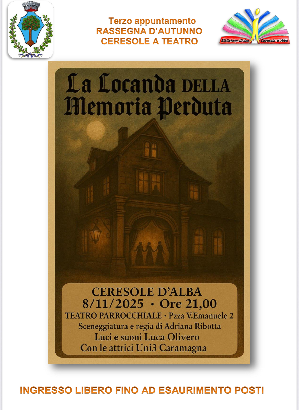 Sabato 8 novembre terzo appuntamento della rassegna teatrale d'autunno dal titolo "La locanda della memoria perduta", alle ore 21:00 presso il cinema parrocchiale in Piazza Vittorio Emanuele II, ingresso libero.