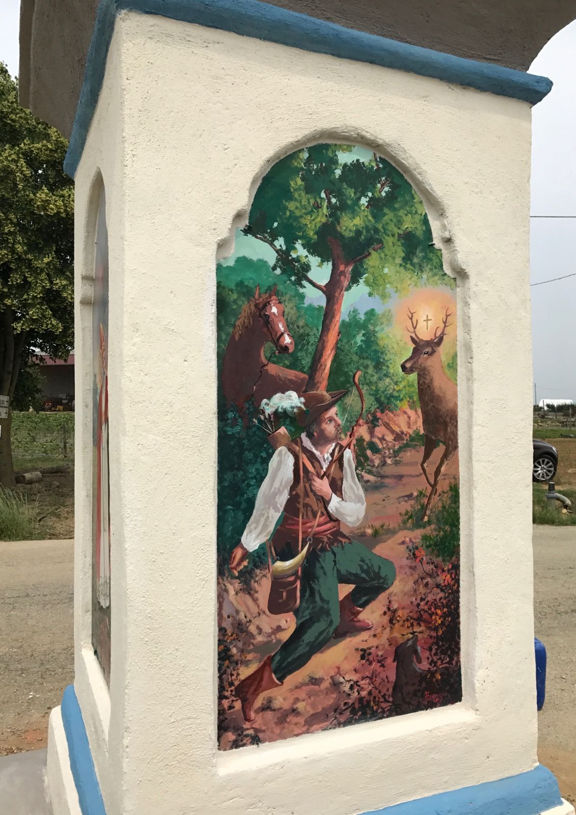Abbiamo così pensato che fosse raffigurato Sant’ Uberto. Il cacciatore che accompagnato dal suo cane Lola, mentre tirava la freccia ad un cervo, ebbe la visione della croce in mezzo al trofeo dell’animale e non fu più in grado di lanciare la freccia. Dopo questa visione Uberto si convertì.