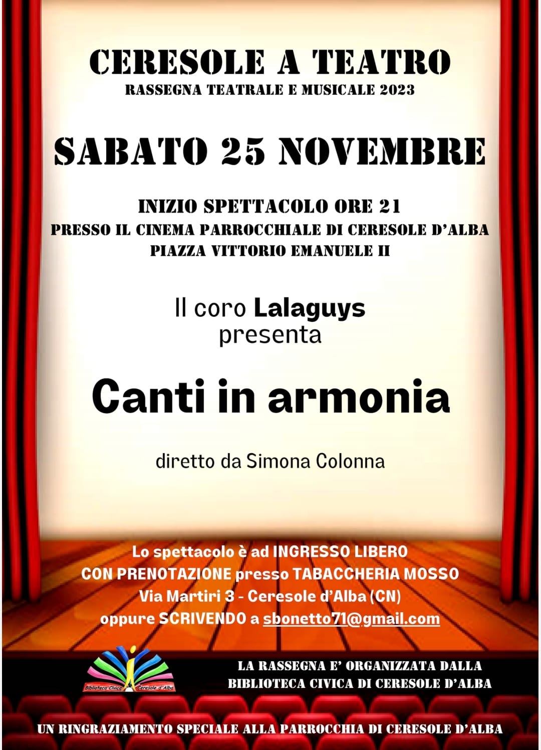 Sabato 25 novembre presso il teatro parrocchiale di Ceresole d'Alba si terrà lo spettacolo "Canti in armonia" con il coro Lalaguys diretto da Simona Colonna. Ingresso libero.