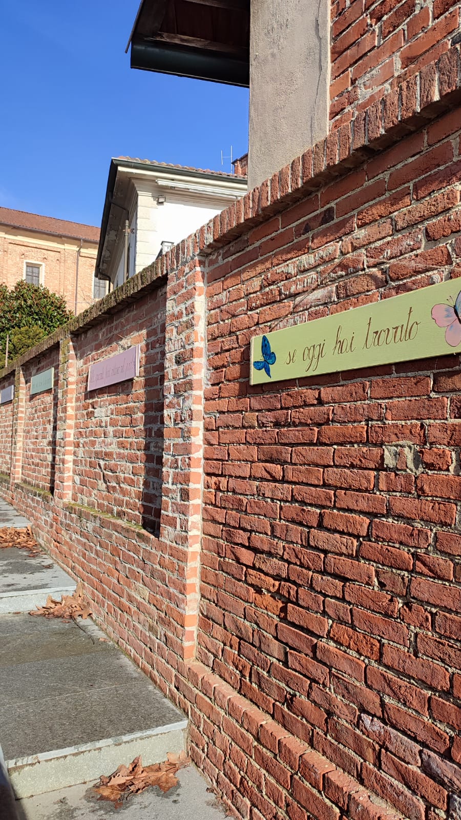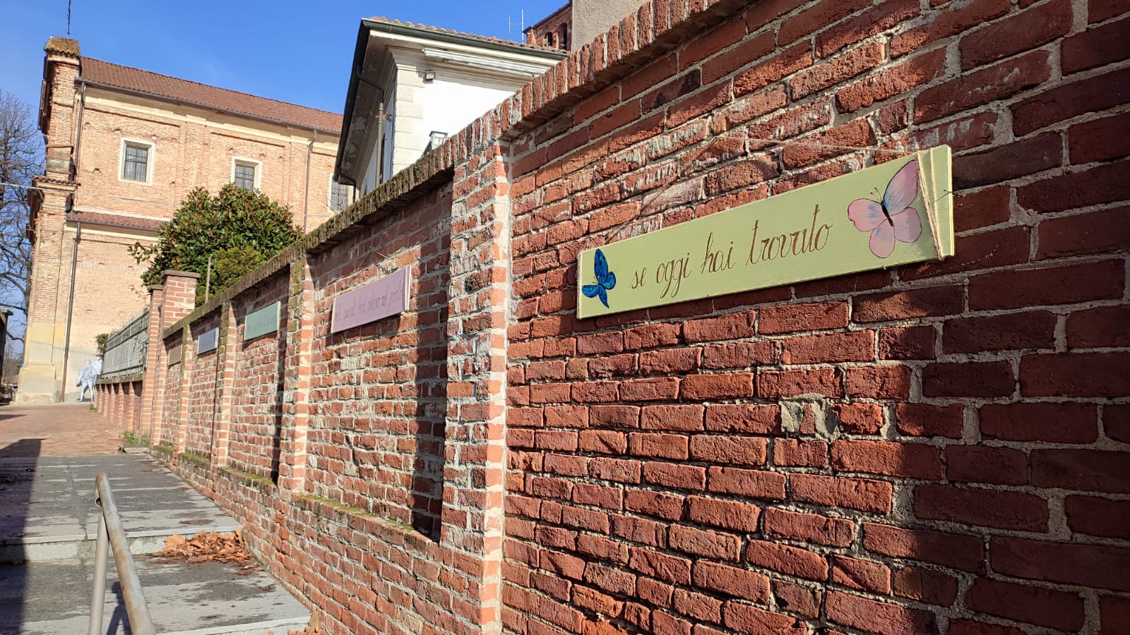 Grazie ai volontari della Biblioteca Civica di Ceresole d’Alba che hanno risistemato nel vicolo delle farfalle i pannelli esposti durante la festa patronale dello scorso mese di settembre. Si tratta di una poesia di Lino Perlo, Ceresolese mancato da qualche anno. In biblioteca è custodito il libro che raccoglie le sue poesie - insieme a quelle della sorella - una delle quali ha un riferimento alle farfalle: da ciò è nata l’idea di abbellire il vicolo con dei pannelli colorati, riportanti i versi della poesia.