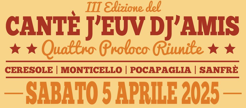 Sabato 5 aprile si svolgerà la terza edizione del "Cantè j'euv dj'amis" a Monticello d'Alba con la partecipazione di quattro Pro Loco tra cui Ceresole d'Alba.