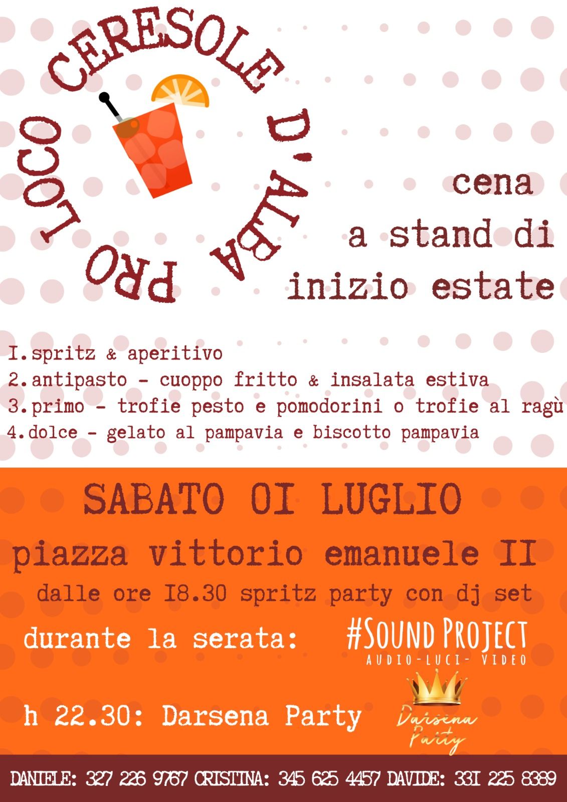 La Proloco organizza per sabato 1 luglio a Ceresole d'Alba una "Cena a stand di inizio estate" seguito dal "Darsena party".