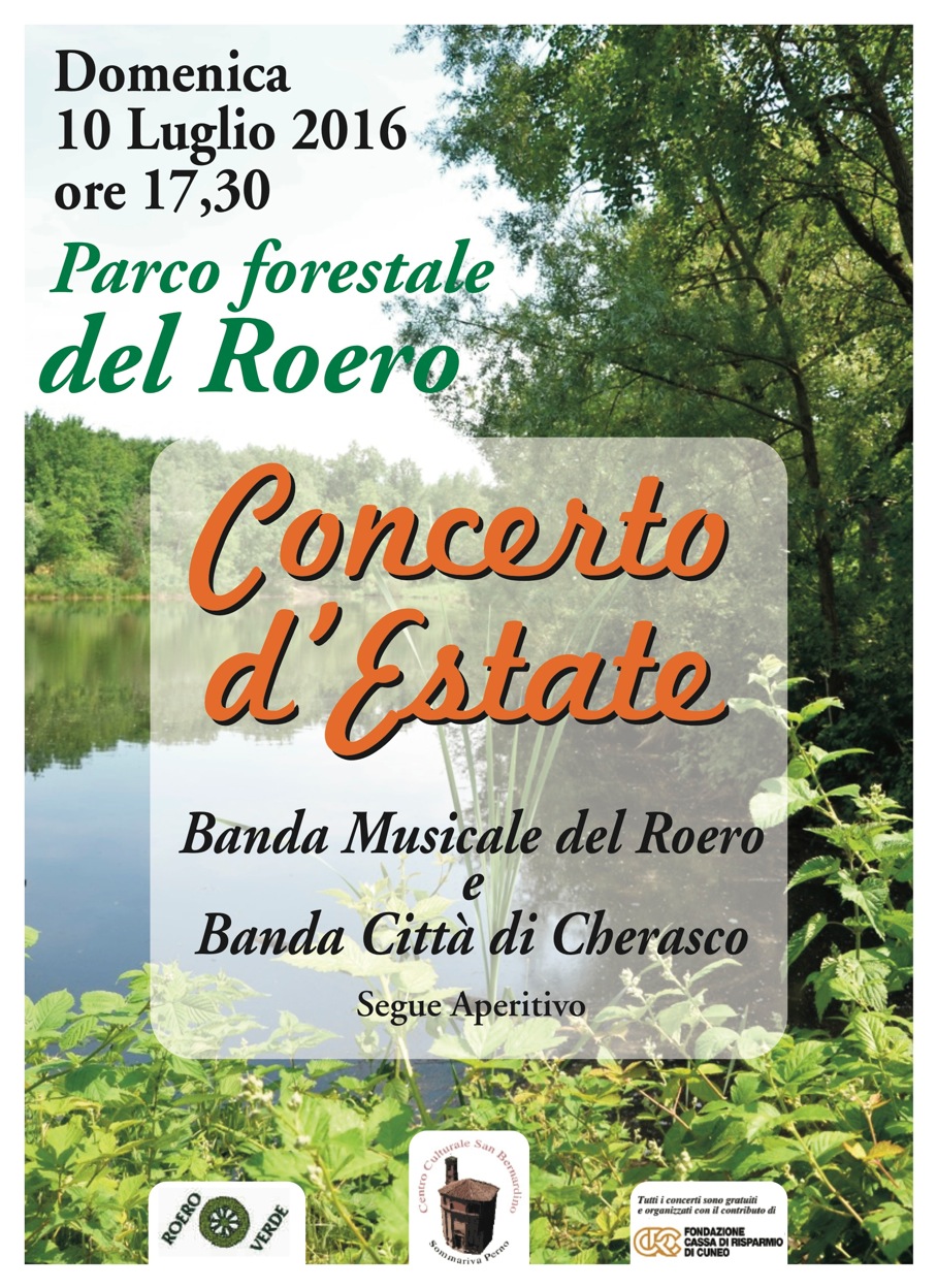 Domenica 10 luglio alle ore 17.30 si terrà un “Concerto d’estate” presso il Parco forestale del Roero, a Sommariva Perno. Il concerto sarà eseguito dalla Banda Musicale del Roero e dalla Banda Città di Cherasco. Seguirà aperitivo.