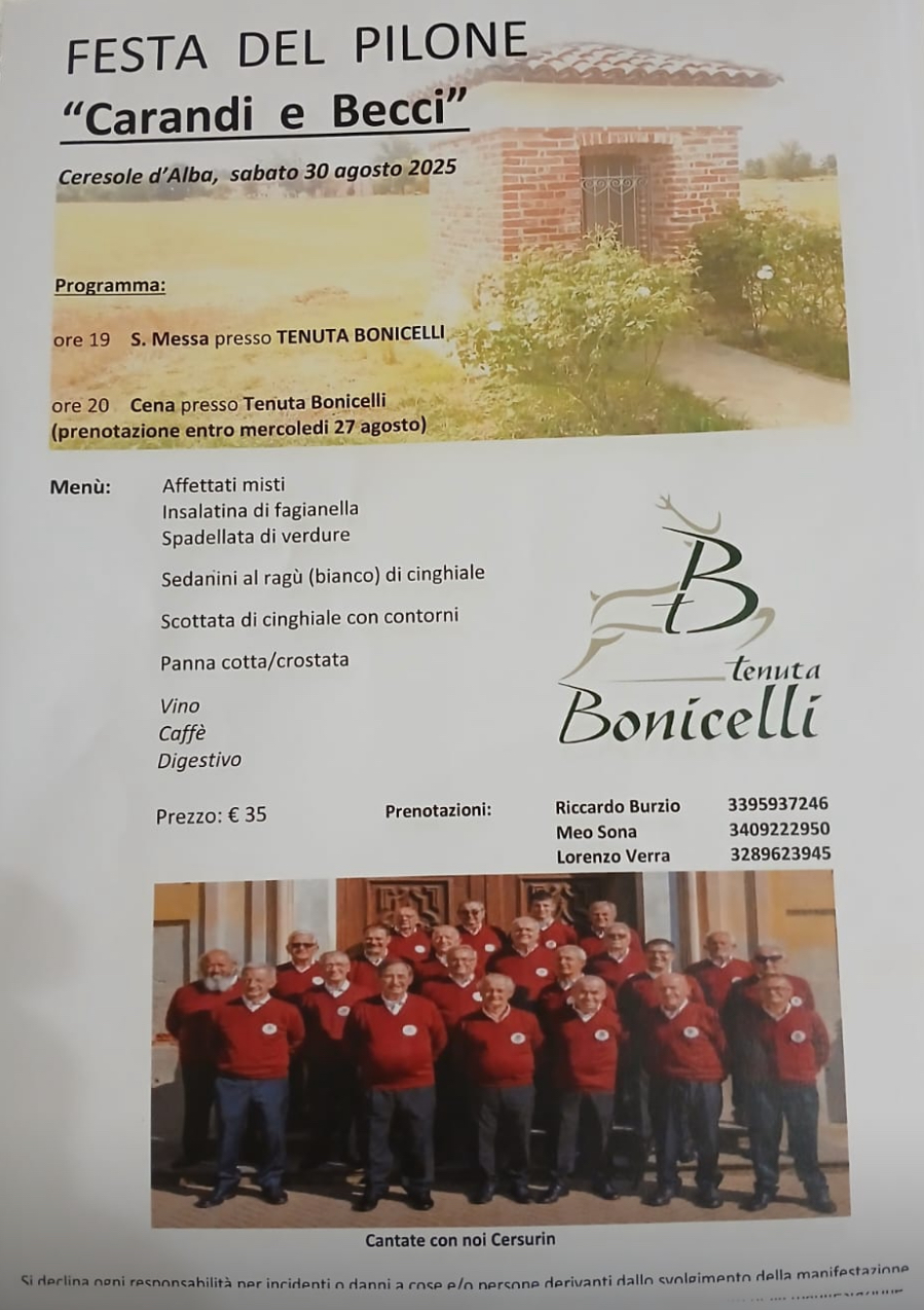 Sabato 30 agosto torna il consueto appuntamento per la festa del pilone "Carandi e Becci", che si svolgerà presso Tenuta Bonicelli: alle ore 19:00 S. Messa e alle ore 20:00 cena.