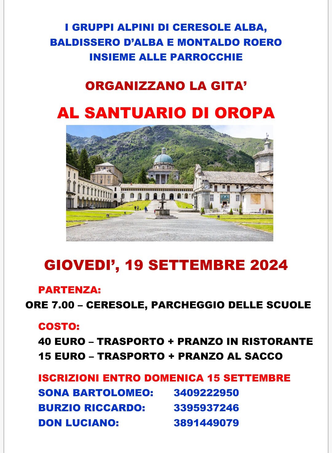 I gruppi Alpini di Ceresole d'Alba, Baldissero d'Alba e Montaldo Roero insieme alle parrocchie organizzano per giovedì 19 settembre 2024 la gita al Santuario di Oropa.