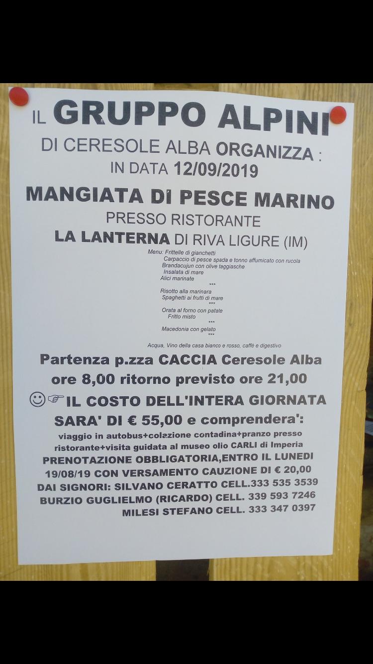 Il Gruppo Alpini di Ceresole d'Alba organizza per GIOVEDI 12 settembre una gita con "mangiata di pesce marino" presso il ristorante la Lanterna di Riva Ligure (IM).