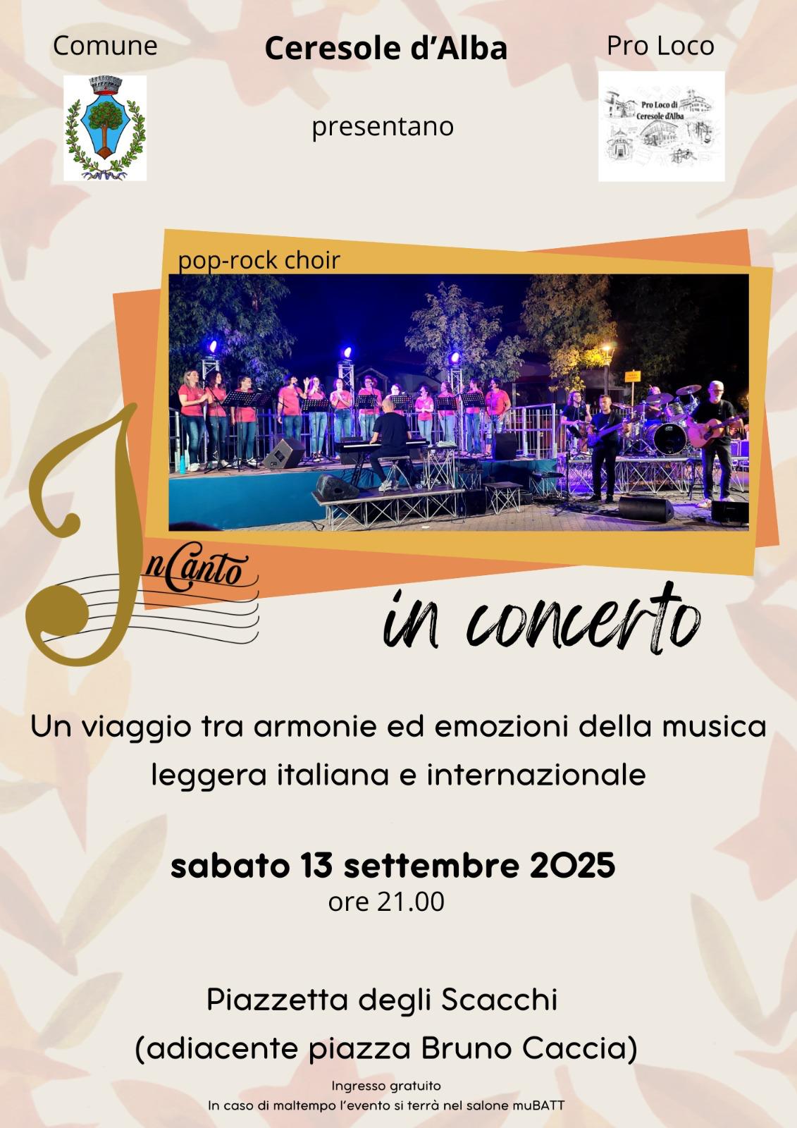 Sabato 13 settembre alle ore 21:00 il Comune in collaborazione con la Pro Loco di Ceresole d'Alba organizza un concerto in Piazza Scacchi, un viaggio tra armonie ed emozioni della musica leggera italiana e internazionale.