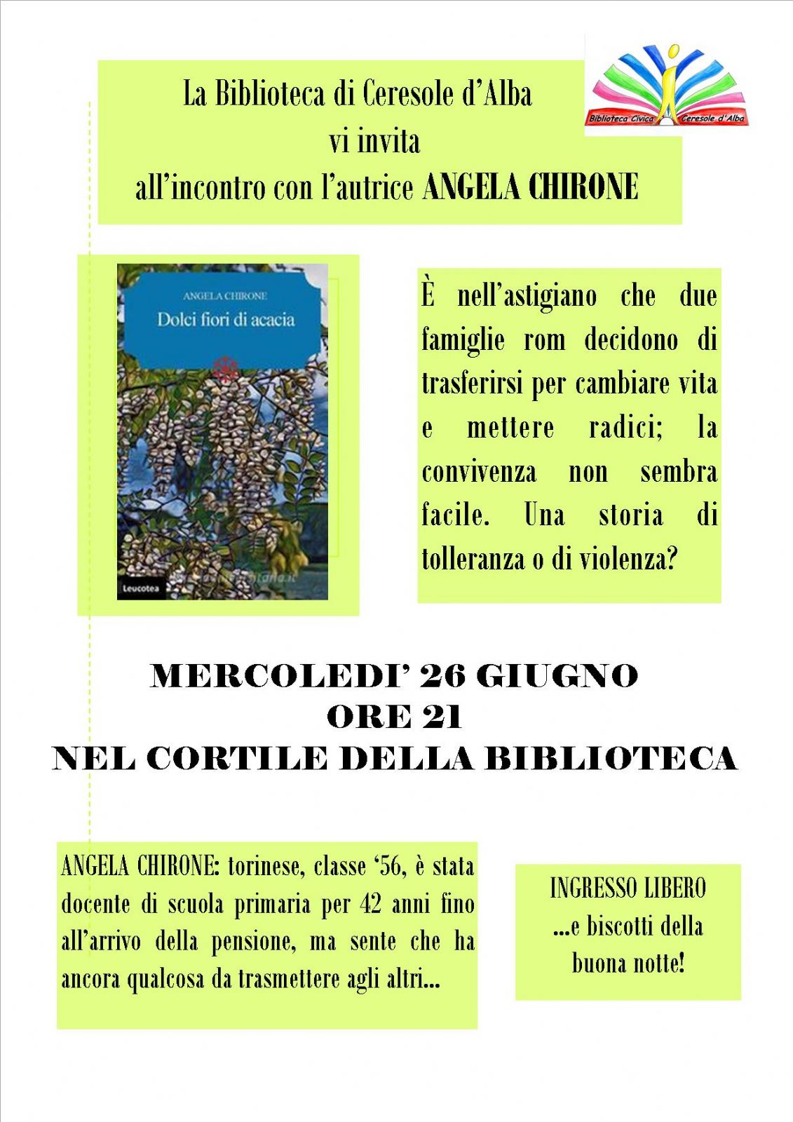 La Biblioteca Civica di Ceresole d'Alba vi invita MERCOLEDI 26 GIUGNO ore 21 alla presentazione del libro "Dolci fiori di acacia" di Angela Chirone.