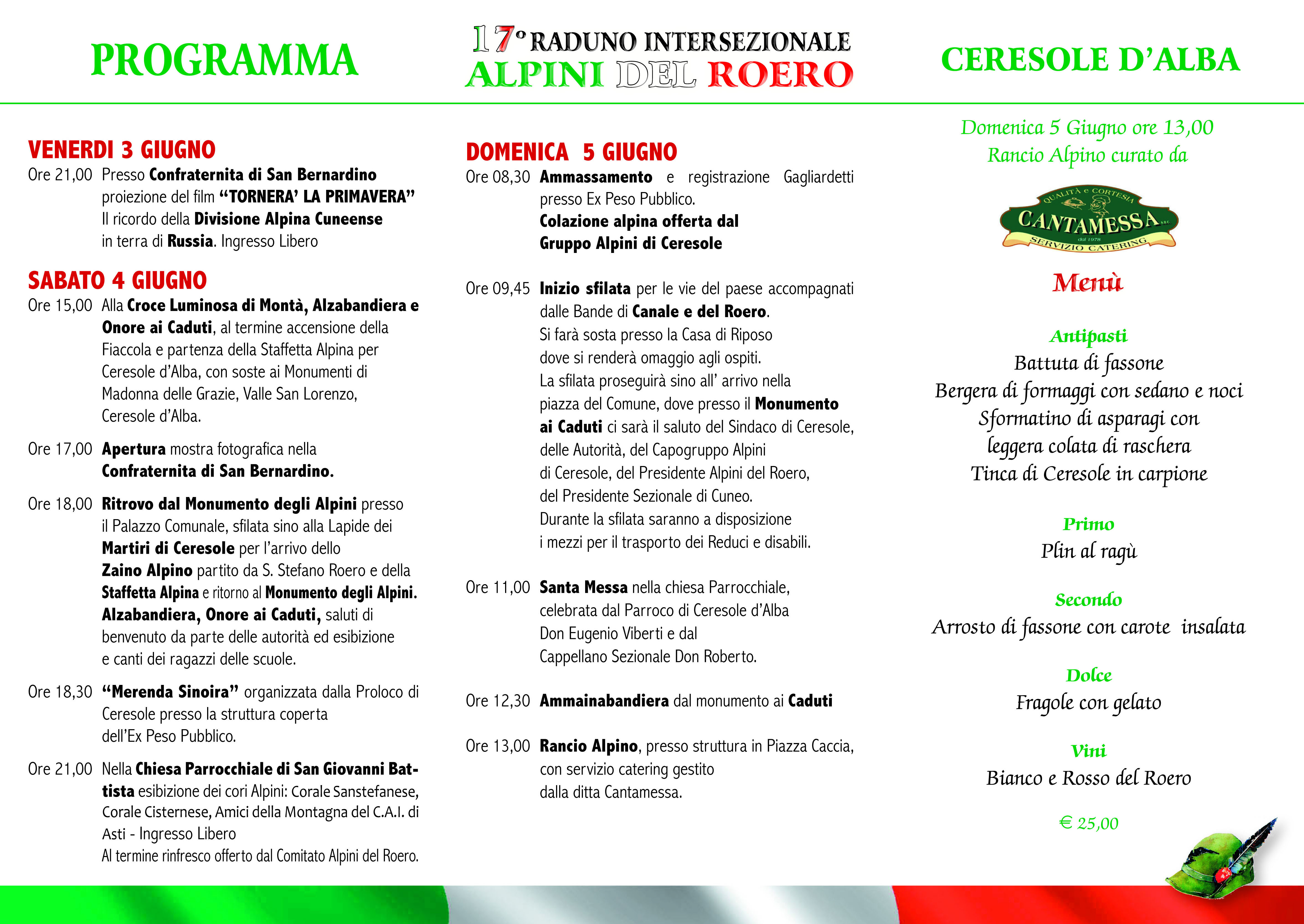 Si è svolto nei giorni di venerdì 3 giugno, sabato 4 e domenica 5 a Ceresole d'Alba il 17° RADUNO INTERSEZIONALE ALPINI DEL ROERO.