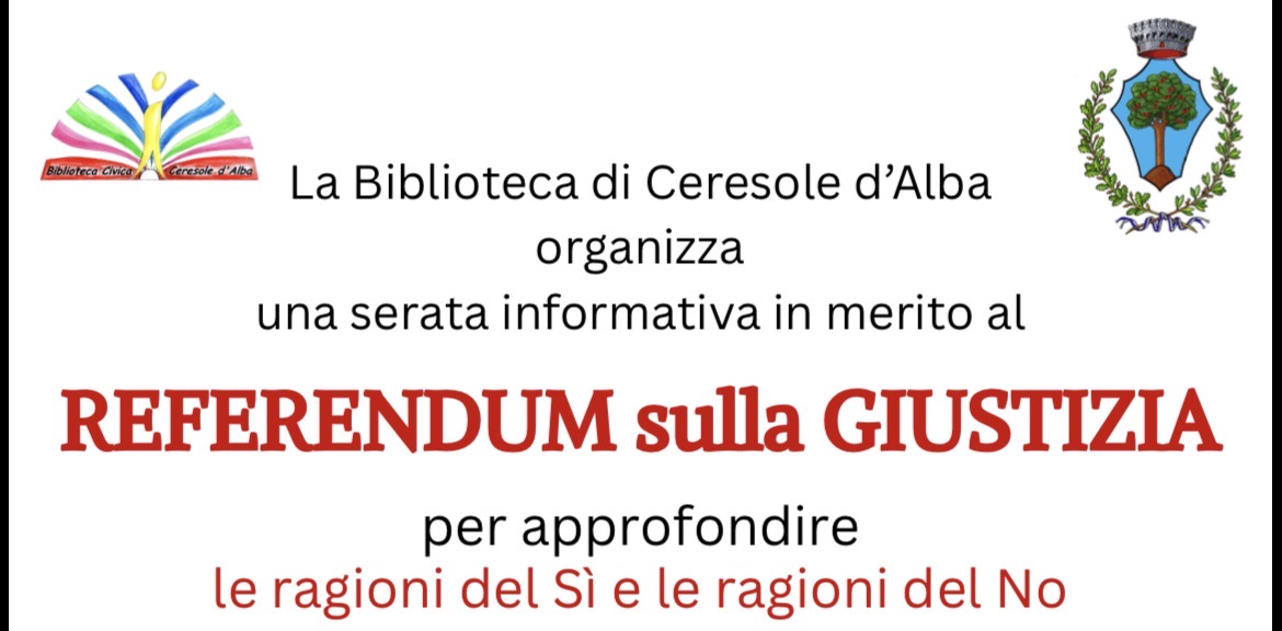 Lunedì 23 settembre alle ore 21:00 presso il salone del Mubatt la Biblioteca Civica di Ceresole d’Alba organizza una serata informativa sul prossimo referendum sulla giustizia, per approfondire le ragioni del sì e le ragioni del no.