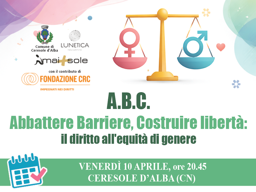 L’iniziativa è promossa dal Comune di Ceresole d’Alba e da Lunetica, insieme all’associazione Mai+Sole, con il contributo di Fondazione CRC, e intende offrire uno spazio di approfondimento aperto alla cittadinanza, partendo dalla vita quotidiana per analizzare dinamiche relazionali, stereotipi e segnali spesso invisibili ma fondamentali per costruire relazioni sane ed equilibrate.
